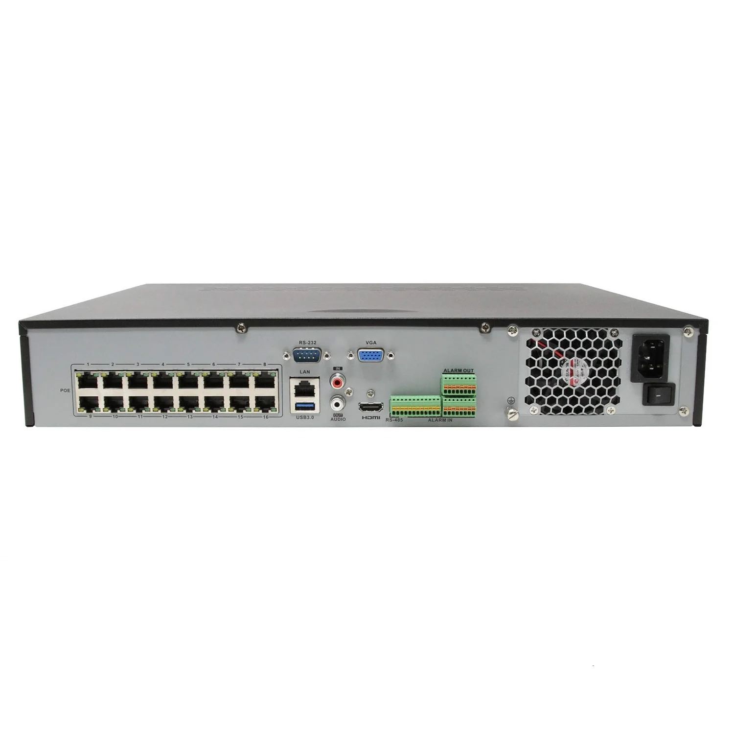 - **Tecnología POE**: Equipado con 16 puertos POE (Power over Ethernet), que permiten la transmisión de datos y alimentación eléctrica a las cámaras a través de un único cable, simplificando la instalación y reduciendo costes de cableado.