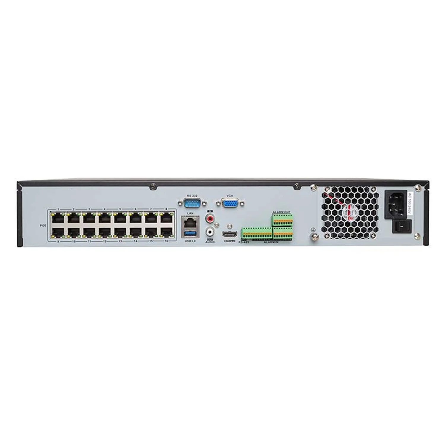 - 16 puertos POE integrados, que permiten la conexión y alimentación de cámaras IP directamente desde el NVR, simplificando la instalación y reduciendo la necesidad de cableado adicional.