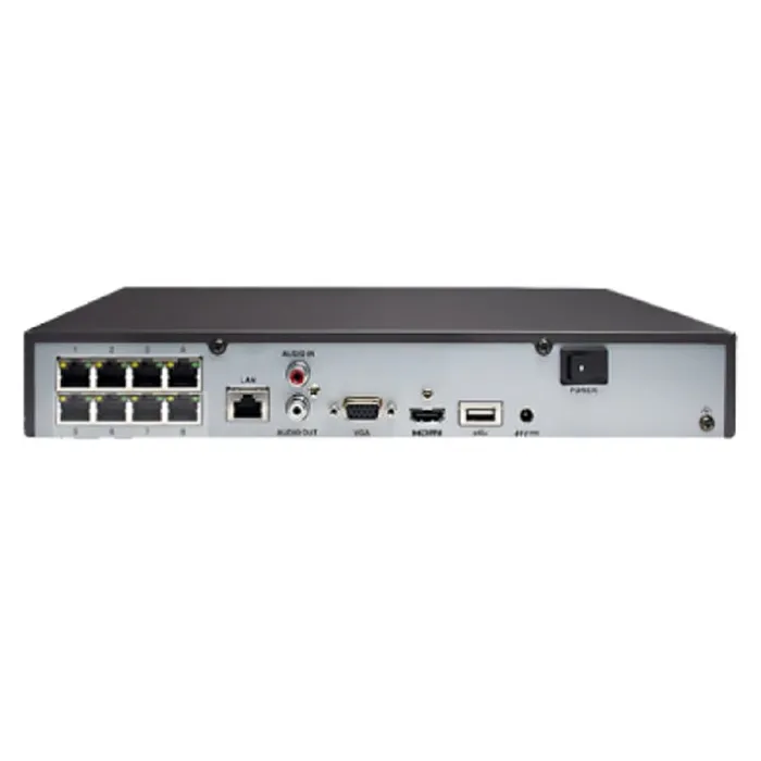 - **8 Puertos POE:** Los puertos Power over Ethernet (POE) facilitan la alimentación directa de las cámaras IP, eliminando la necesidad de un cableado adicional para la energía, simplificando así la instalación y reduciendo costos.