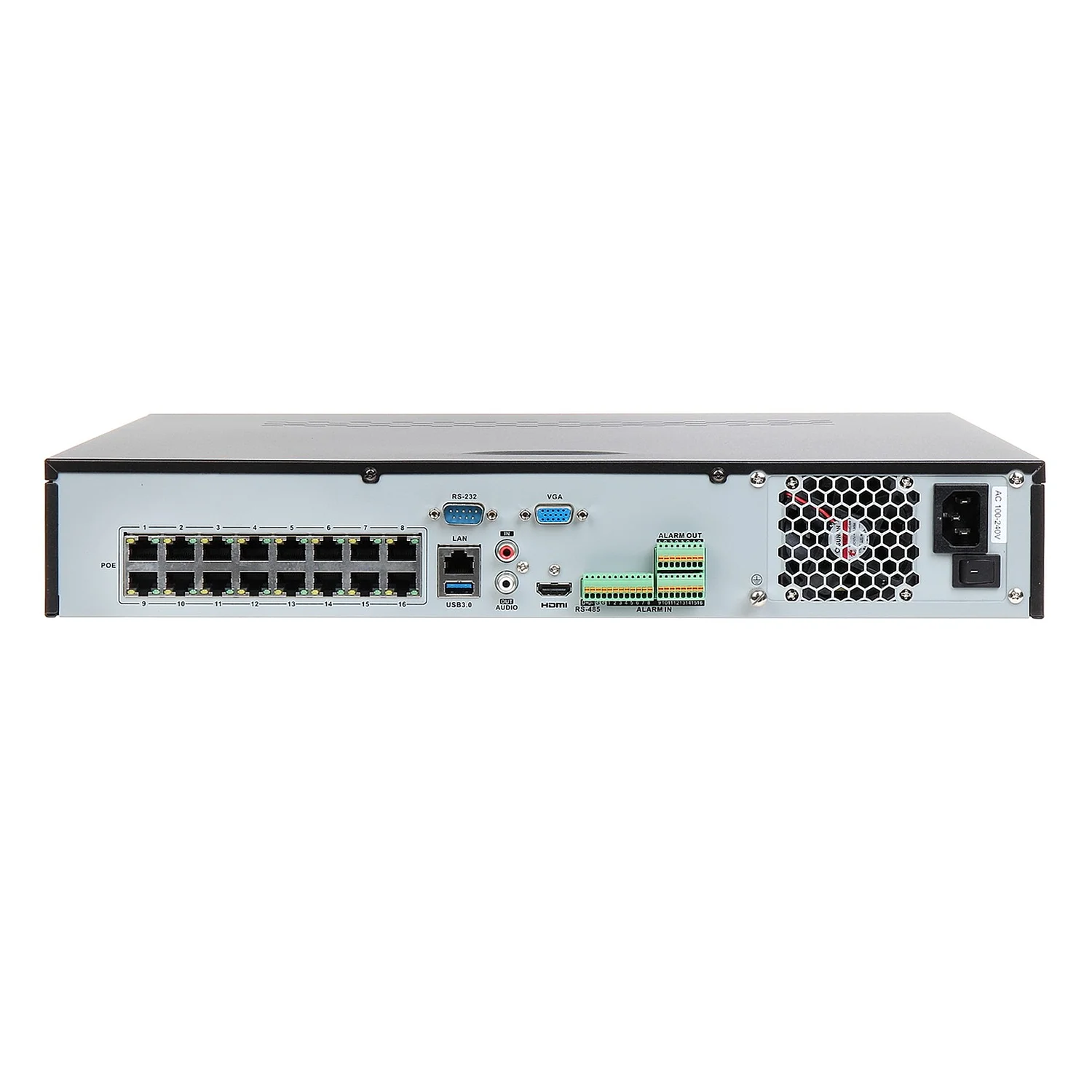 Los 16 puertos PoE+ no solo alimentan las cámaras instaladas, sino que también actúan como un switch interno, lo que elimina la necesidad de equipos adicionales y reduce el cableado, garantizando una conexión estable hasta distancias extendidas (hasta 300 metros).
