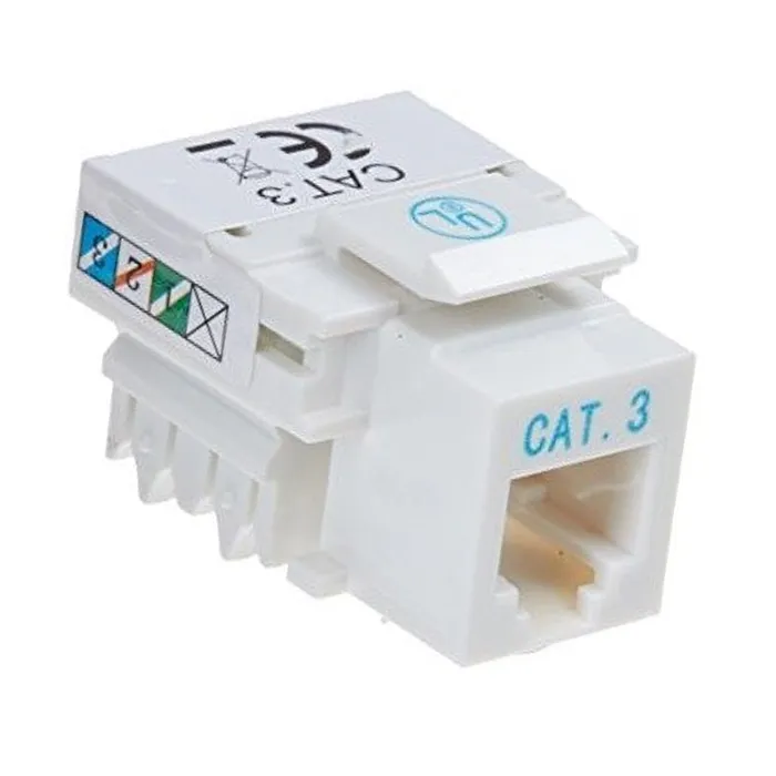 El conector Keystone Jack Coupler Categoría 3 de Wireplus, modelo WP-KRJ-C3TLF, es una solución eficaz para la interconexión de cables de red en aplicaciones de telecomunicaciones y redes de datos. Este conector se presenta en un elegante acabado blanco, diseñado específicamente para integrarse de manera eficiente en entornos tanto residenciales como comerciales. Su diseño modular permite una fácil instalación y reemplazo en cualquier tipo de panel de conexiones o placas de pared.