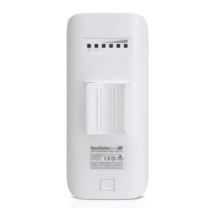 La NanoStation locoM5 está equipada con una antena integrada de 13 dBi, lo que facilita la captura de señales a larga distancia y mejora la estabilidad de la conexión. Este dispositivo destaca por su diseño compacto y su facilidad de instalación, lo que permite que los instaladores lo implementen rápidamente en diversas ubicaciones. Además, cuenta con un soporte para montaje en pared o mástil, lo que ofrece flexibilidad en la ubicación de la unidad.