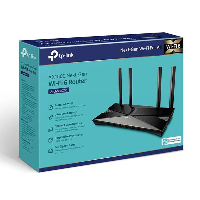 El TP-Link AX10-ARCHER es un router inalámbrico WiFi de doble banda que utiliza la tecnología WiFi 6 (802.11ax) para proporcionar un rendimiento superior y una conectividad estable en entornos residenciales o pequeños negocios. Con una velocidad total de hasta 1500 Mbps, este dispositivo está diseñado para satisfacer las demandas de conectividad de múltiples dispositivos al mismo tiempo, ofreciendo una experiencia de navegación fluida, óptima para streaming en alta definición, juegos en línea y videoconferencias.