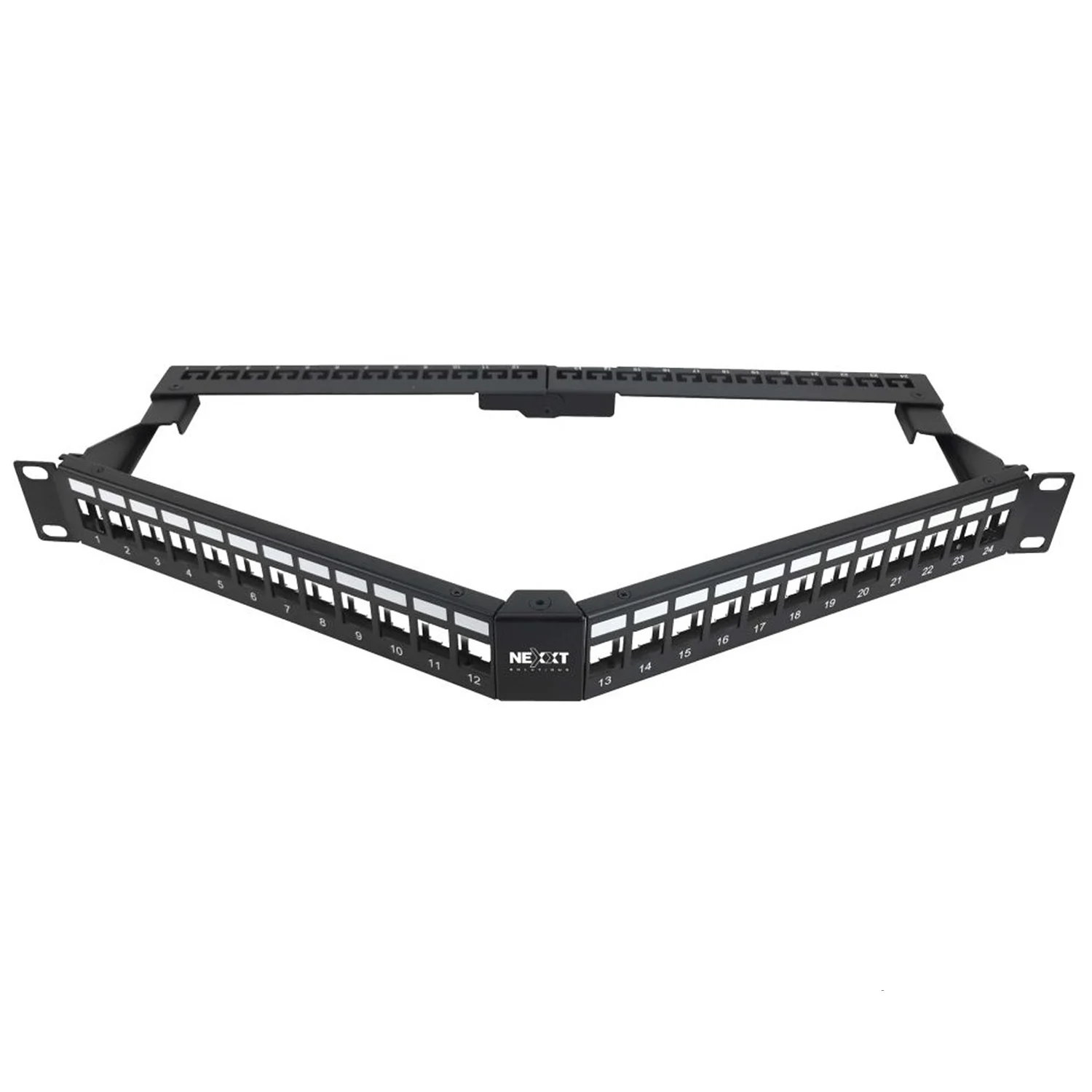 Este patch panel está diseñado para acomodar hasta 24 conexiones RJ45 en un formato de 1U, lo que proporciona una alta densidad de puertos en un espacio reducido. Está construido con materiales de alta calidad que garantizan durabilidad y resistencia al desgaste, asegurando un rendimiento fiable a largo plazo. Además, su diseño angular permite una mejor gestión del cableado, facilitando la organización y minimizando la congestión en el rack.