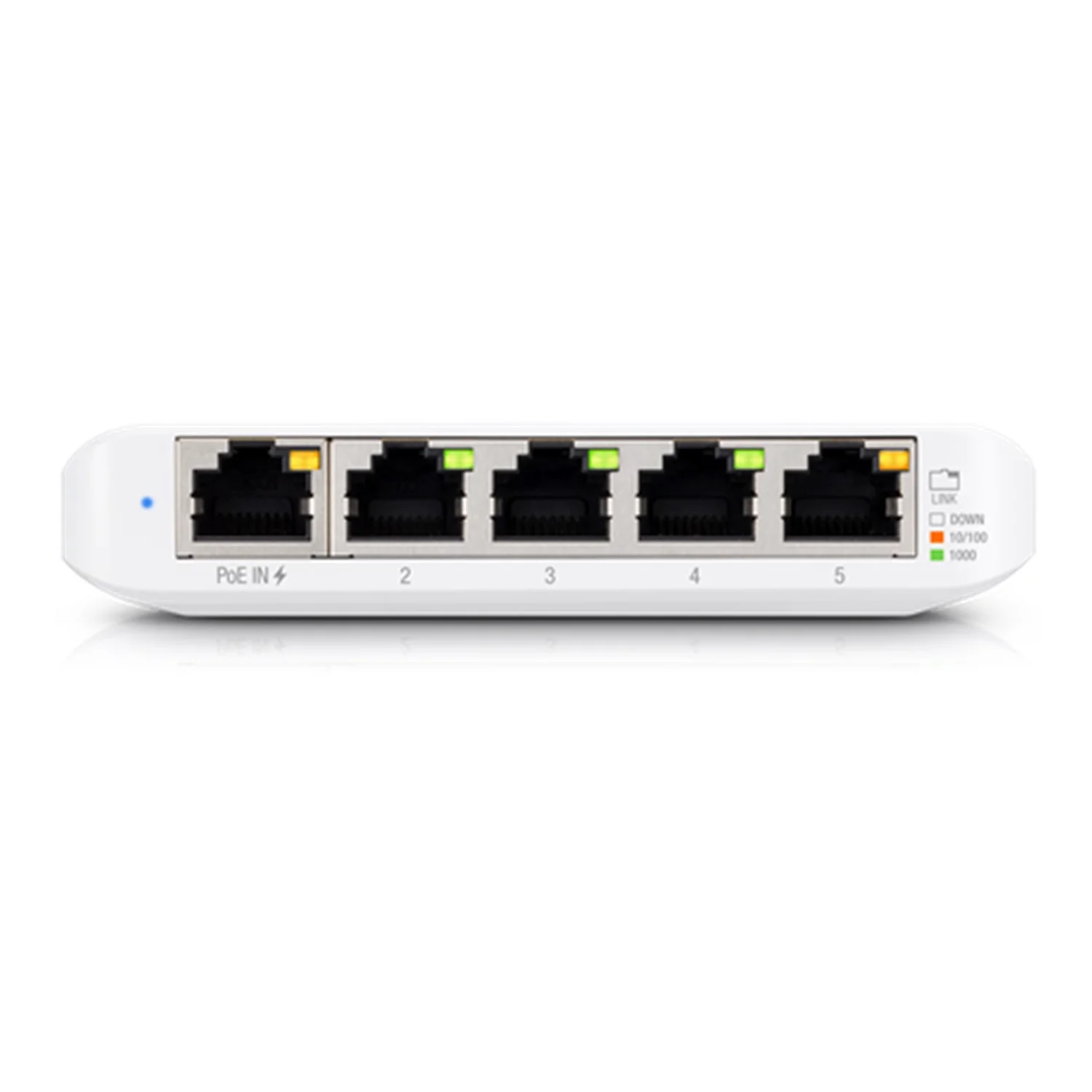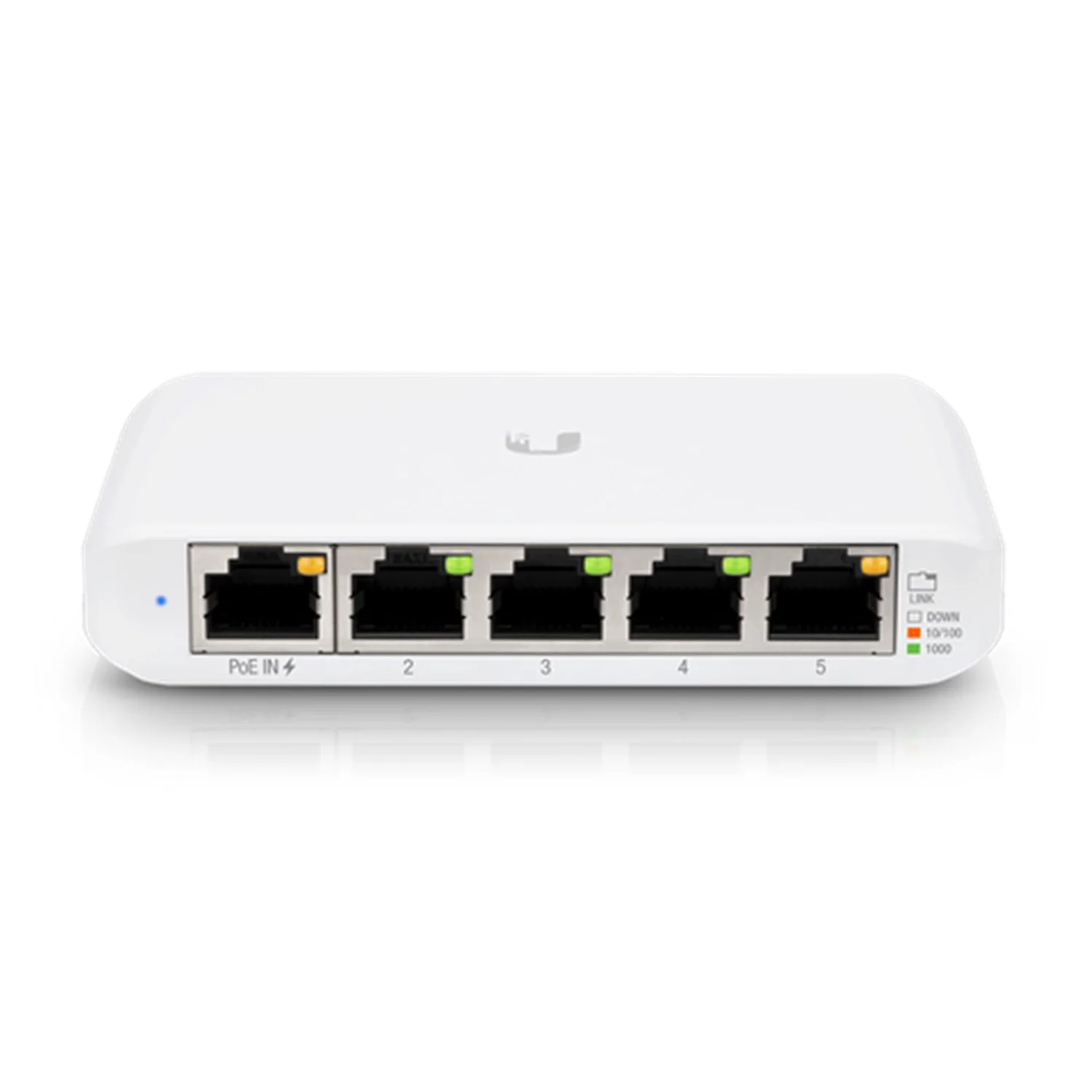 El USW-FLEX-MINI cuenta con cinco puertos RJ45 que soportan velocidades de hasta 1 Gbps, permitiendo la conexión de múltiples dispositivos simultáneamente sin comprometer el rendimiento. Este switch es administrable, lo que otorga a los instaladores la capacidad de configurar y gestionar la red a través de la interfaz de usuario de UniFi Network. Algunas características destacadas incluyen: