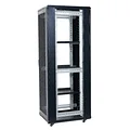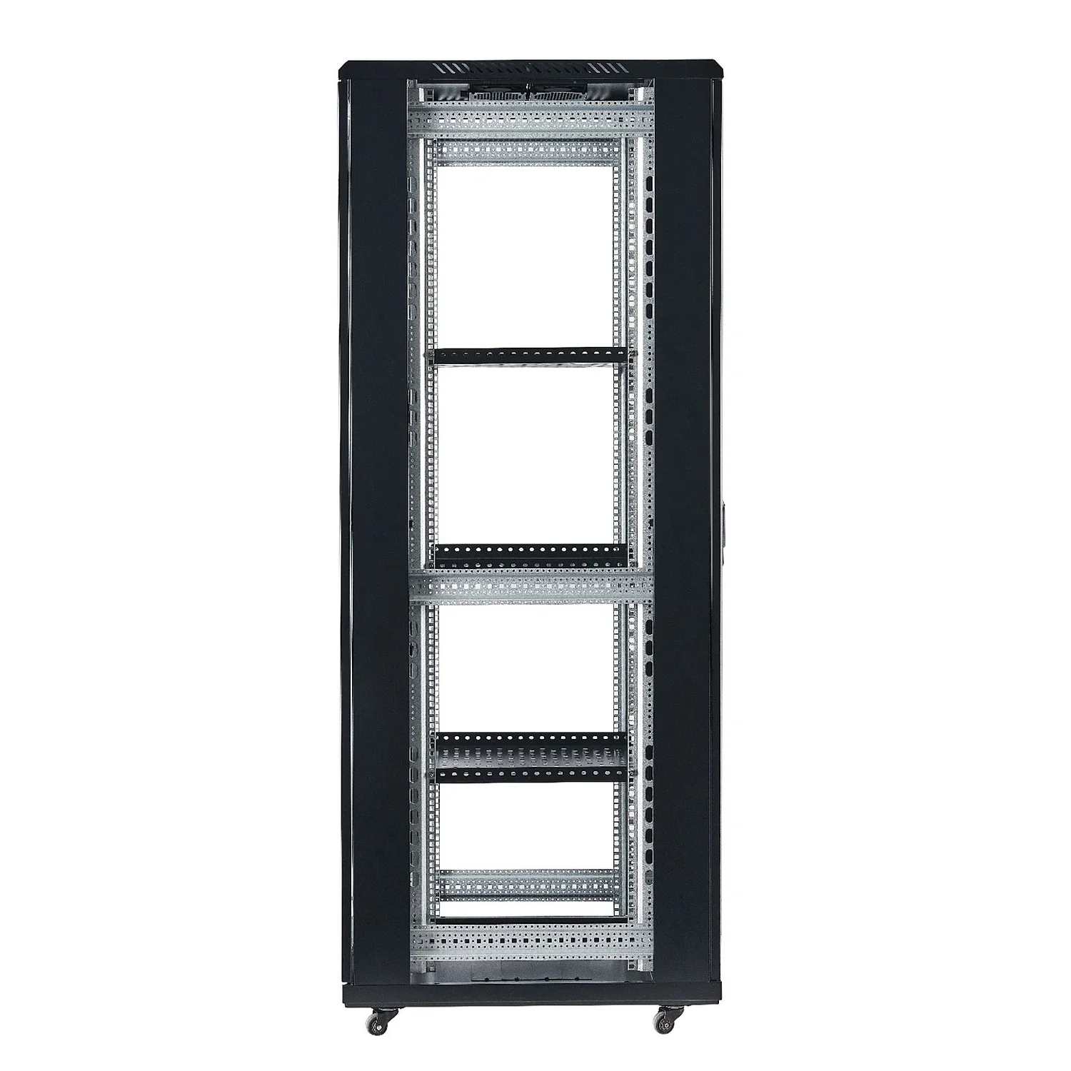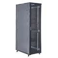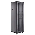 Este rack cuenta con una estructura metálica de alta resistencia, capaz de soportar un peso considerable y ofrecer la estabilidad necesaria para equipos pesados. Las puertas delanteras y traseras están diseñadas con malla, lo que permite una adecuada ventilación del aire, favoreciendo la refrigeración de los equipos instalados y previniendo el sobrecalentamiento.