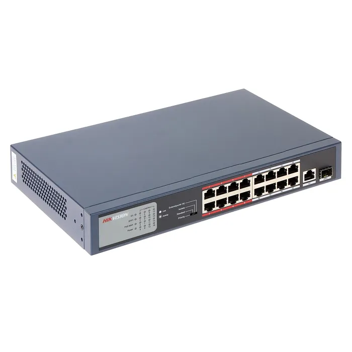 - Puertos de red: 16 puertos 10/100 Mbps PoE, 1 puerto Gigabit, 1 puerto SFP.