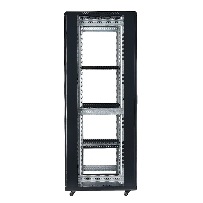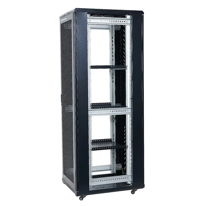 Este rack está fabricado con acero de alta calidad, garantizando una estructura resistente que soporta un peso considerable. La puerta frontal de malla favorece el flujo de aire, mientras que las puertas traseras de malla permiten un fácil acceso a los componentes y al cableado. Además, el acabado en pintura electrostática proporciona una protección adicional contra la corrosión y el desgaste, asegurando longevidad en diversas condiciones ambientales.