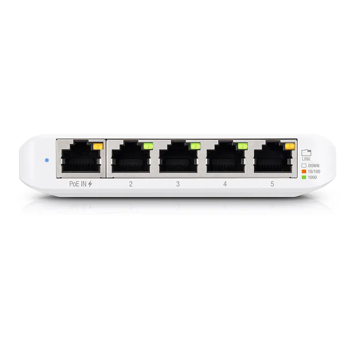 El [USW-FLEX] cuenta con cinco puertos Gigabit Ethernet, todos ellos capaces de proporcionar alimentación a dispositivos compatibles con PoE. Este switch cumple con el estándar 802.3bt, lo que permite una mayor potencia de salida, ideal para dispositivos que requieren más energía, como cámaras de seguridad, puntos de acceso Wi-Fi avanzados y dispositivos IoT. La construcción robusta del switch asegura su funcionamiento en diversas condiciones ambientales, lo que lo hace apto para su instalación tanto en interiores como en exteriores.