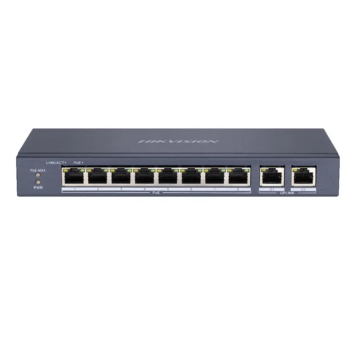 El DS-3E0310P-E/M cuenta con un total de 8 puertos Ethernet, todos ellos operando a velocidades de 10/100 Mbps, y 2 puertos adicionales que ofrecen velocidad Gigabit (10/100/1000 Mbps) para uplink. Esto permite una amplia capacidad de conexión y la posibilidad de ampliar la red de manera fácil y eficiente.