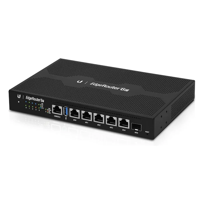 El EdgeRouter 6 PoE Pasivo 24 V de Ubiquiti, modelo ER-6P, es un dispositivo de alto rendimiento diseñado para satisfacer las crecientes demandas de conectividad en redes de pequeña y mediana escala. Este router combina funciones avanzadas de ruteo con un diseño robusto y eficiente, ofreciendo a los instaladores una solución integral para la gestión del tráfico de datos en entornos comerciales y residenciales.