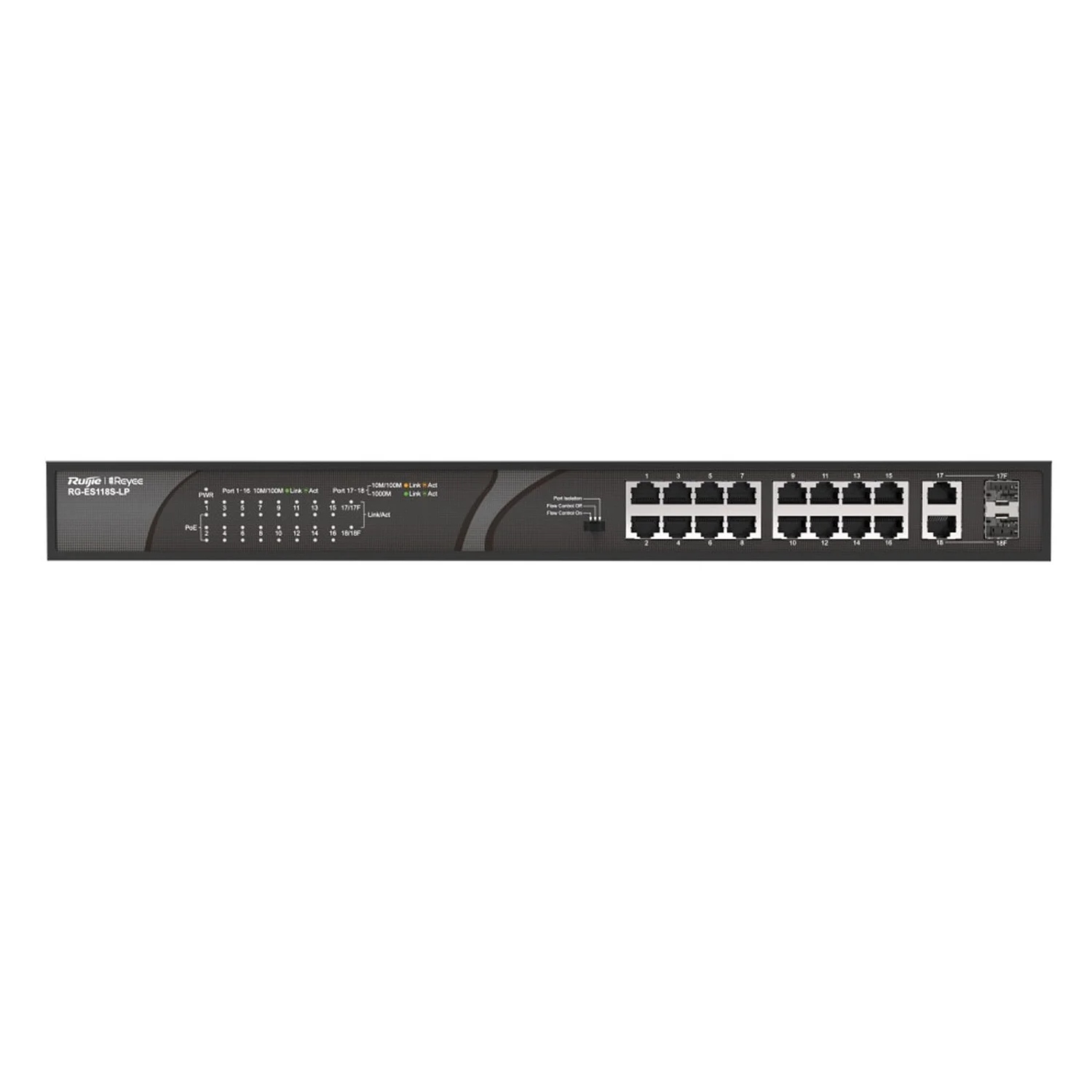 El Ruijie Reyee SMB [RG-ES118S-LP] es un switch de escritorio no gestionado que ofrece una solución eficaz y económica para la expansión de redes. Diseñado con un enfoque en la simplicidad y el rendimiento, este dispositivo cuenta con 16 puertos de 10/100Mbps y 2 puertos Gigabit Ethernet (GE), lo que lo convierte en una opción ideal para entornos de oficina pequeña y medianas empresas que requieren una conectividad robusta y confiable.