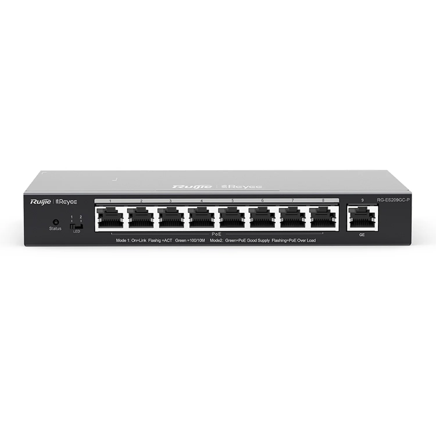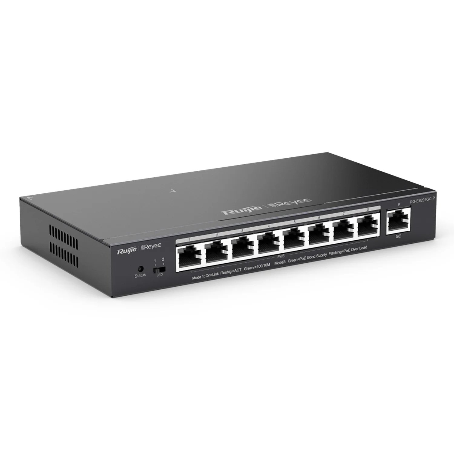 El switch administrable Ruijie Reyee SMB RG-ES209GC-P es una solución avanzada diseñada para aquellas empresas que buscan optimizar su red local con un dispositivo que ofrezca características de alto rendimiento y gestión simplificada. Este switch cuenta con 8 puertos Gigabit PoE+ (802.3af/at), permitiendo la alimentación de dispositivos como cámaras de seguridad, puntos de acceso inalámbricos y teléfonos IP, lo que lo convierte en una opción ideal para entornos empresariales de tamaño mediano.