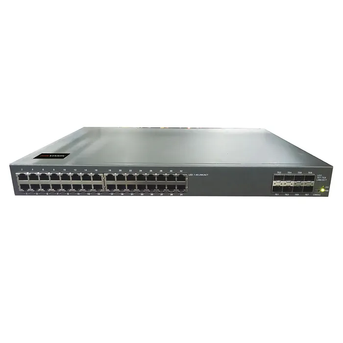 - **Puertos**: 32 puertos Ethernet 10/100/1000 Mbps y 8 puertos SFP+ para conexión de alta velocidad.