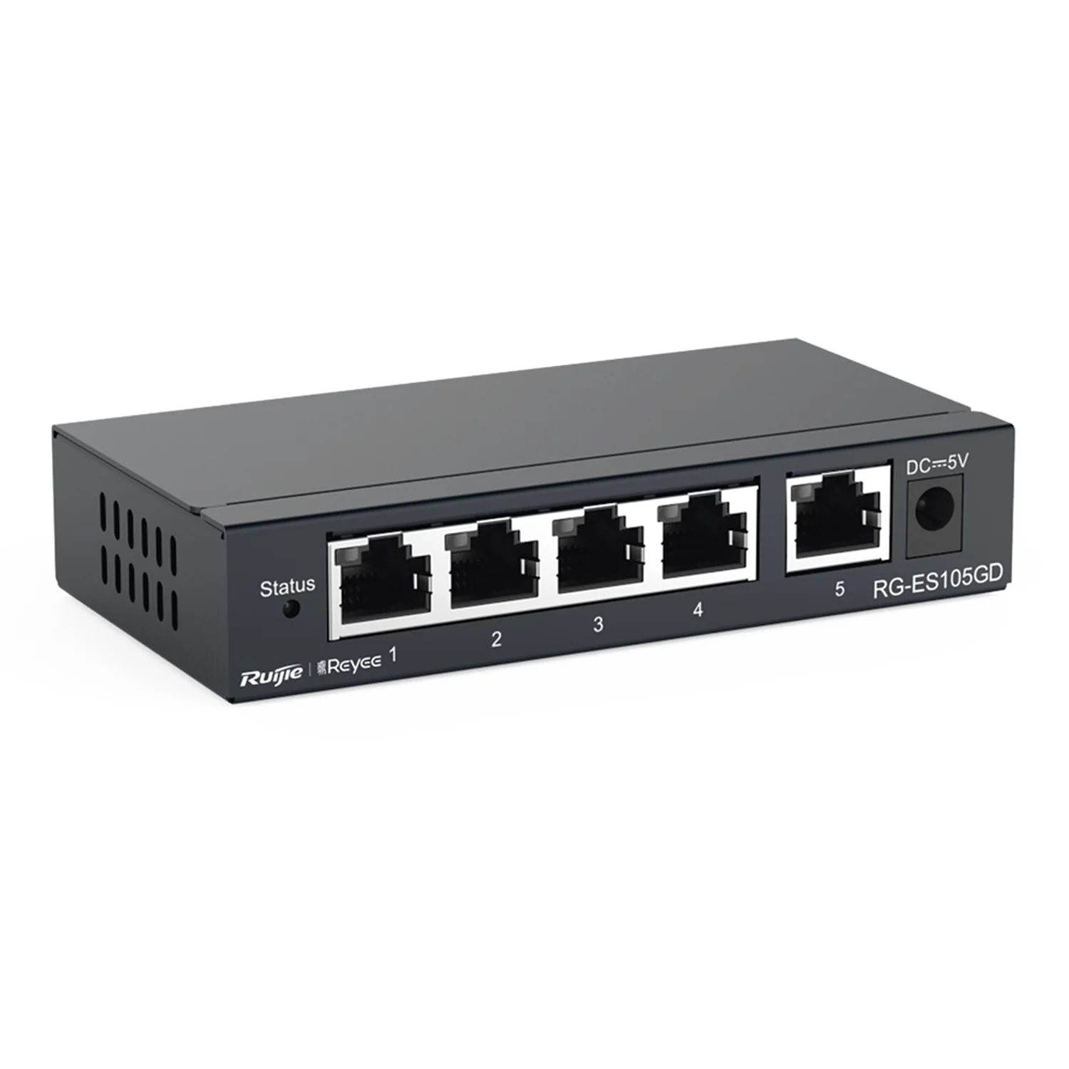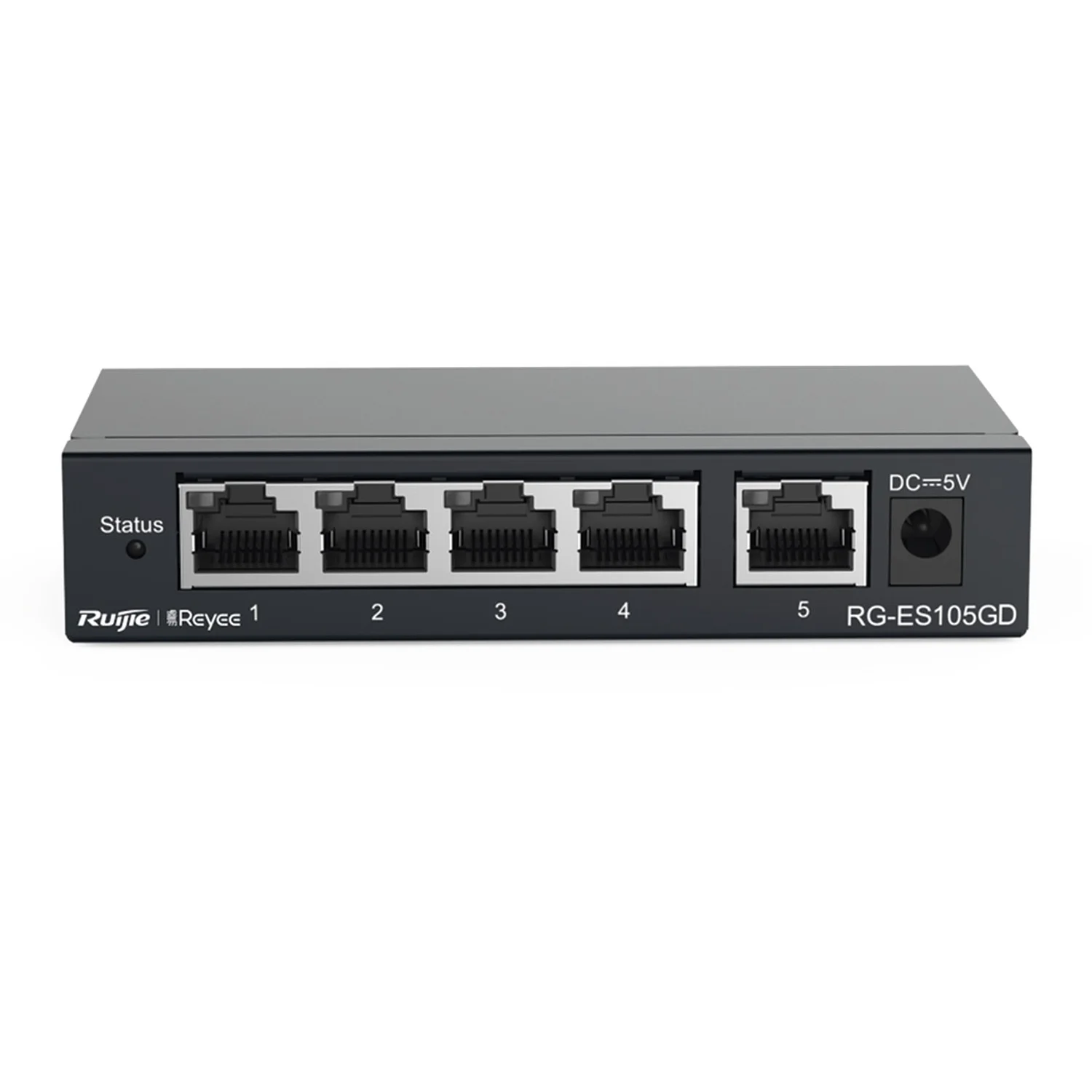 El RG-ES105GD está equipado con cinco puertos Ethernet de 10/100/1000 Mbps, permitiendo conexiones rápidas y eficientes para dispositivos de red. Este switch es no administrable, lo que significa que no requiere configuración adicional, permitiendo una instalación y un despliegue simplificados. Su diseño compacto facilita la implementación en espacios reducidos, mientras que su carcasa metálica asegura durabilidad y una adecuada disipación del calor.