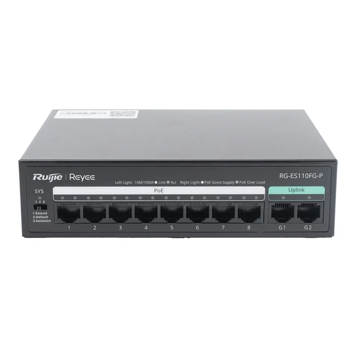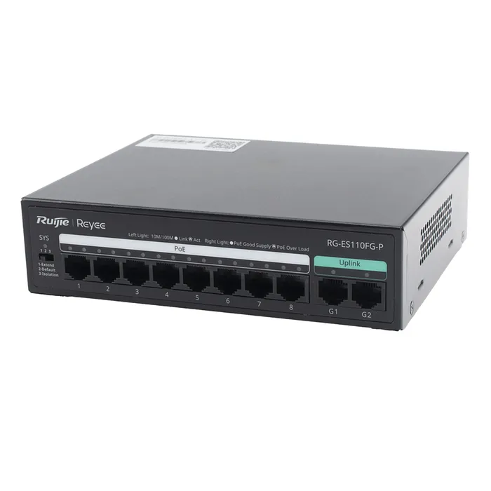 El Ruijie Reyee SMB RG-ES110FG-P es un switch PoE no administrable diseñado específicamente para satisfacer las demandas de pequeñas y medianas empresas que requieren soluciones de red eficientes y versátiles. Este dispositivo cuenta con 10 puertos, de los cuales 2 son Gigabit y 8 son Fast Ethernet (10/100 Mbps), lo que permite una conectividad robusta y de alta velocidad para múltiples dispositivos en una red.