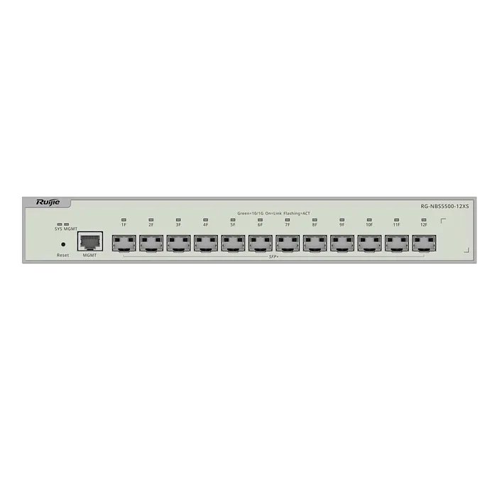El Ruijie Reyee SME cuenta con 12 puertos SFP+ que soportan velocidades de 10G, lo que permite una agregación de datos rápida y eficiente. Esta capacidad de agregación de enlace es fundamental en redes de alto rendimiento, donde se busca optimizar el flujo de datos y reducir la latencia. Además, el switch incluye un puerto de gestión (MGMT) que permite un acceso sencillo para la configuración y monitoreo del dispositivo.