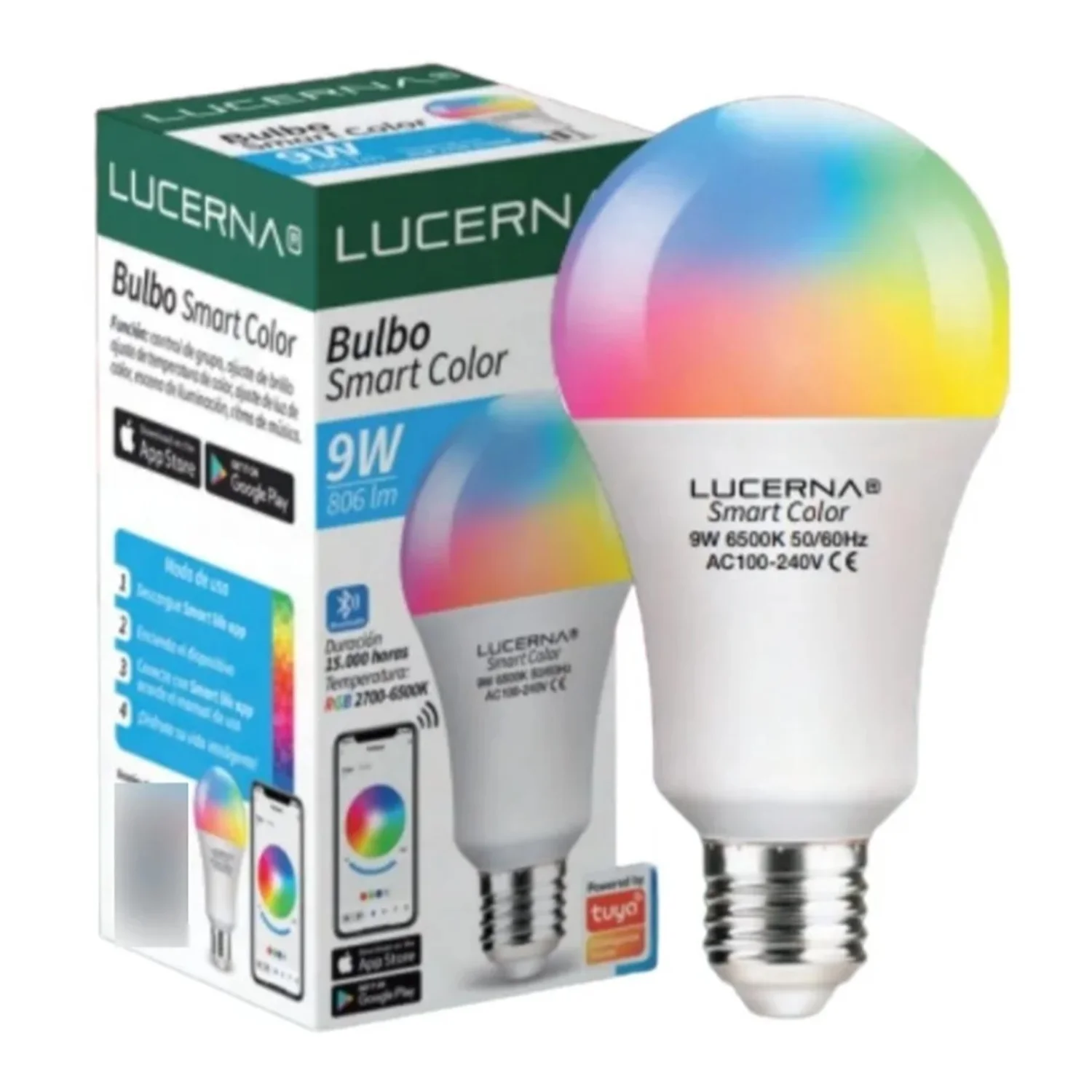 El bombillo LED Smart 9W RGB se caracteriza por su capacidad de emitir luz en una amplia gama de colores, lo que permite adaptar la iluminación a diferentes estados de ánimo y ocasiones. Sus características principales incluyen un consumo de solo 9 vatios, lo que lo convierte en una opción de bajo consumo energético en comparación con los bombillos incandescentes tradicionales. La tecnología LED asegura una larga vida útil, alcanzando hasta 25,000 horas de uso, lo que reduce la frecuencia y el costo de reemplazos.