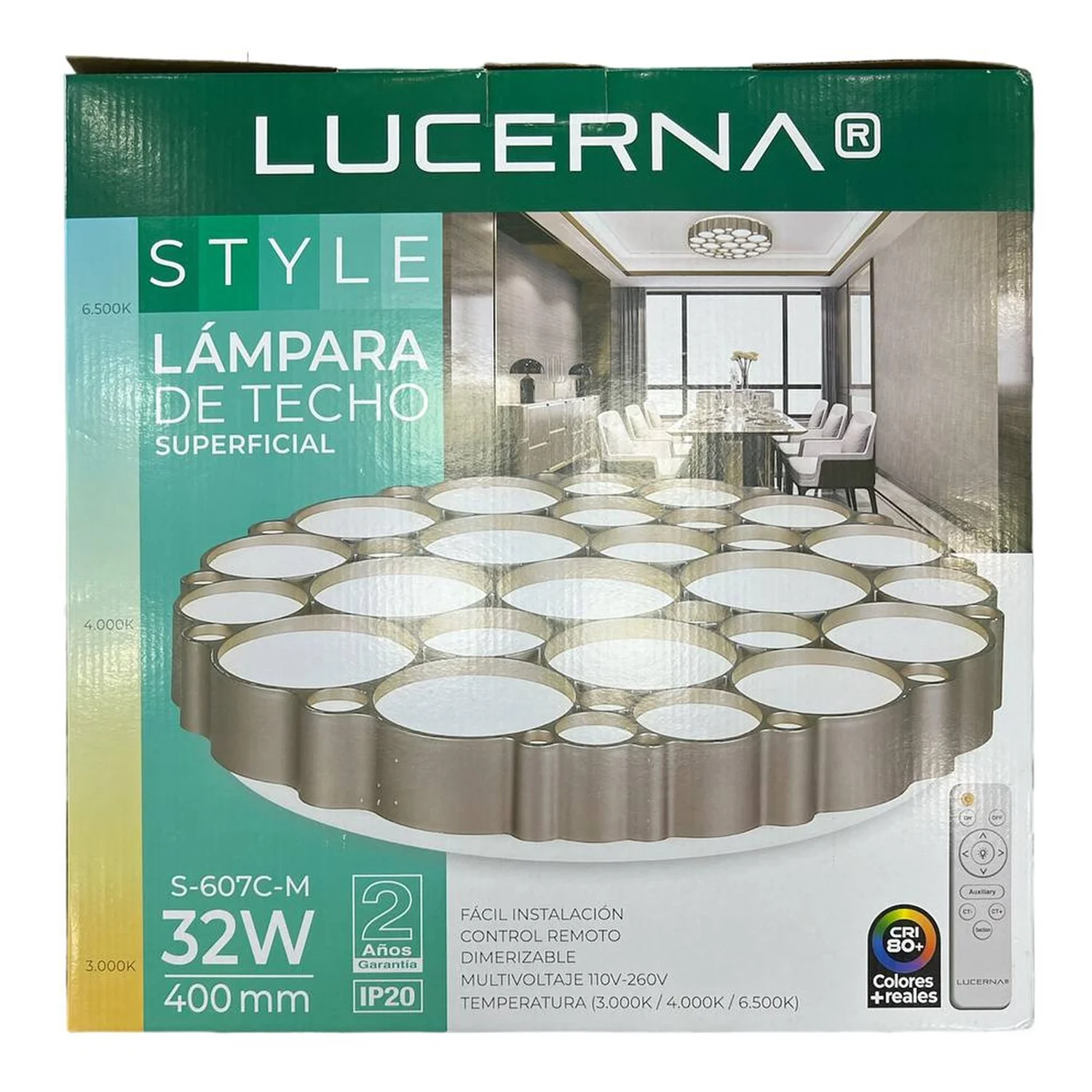 La lámpara de techo S-607C-M Lucerna es un plafón decorativo que combina funcionalidad y diseño elegante. Con una potencia de 32W, esta lámpara ofrece una iluminación eficiente y versátil, ideal para una amplia variedad de entornos. Su diseño de 400mm de diámetro y 85mm de altura la hace adecuada para cualquier espacio, ya sea residencial o comercial.
