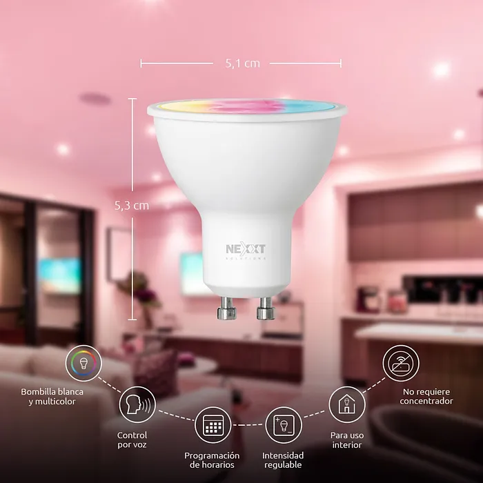 El bombillo LED 4W RGB Inteligente 110V GU10 WiFi de Nexxt Home (NHB-C310) es una solución avanzada para la iluminación ambiental en hogares y oficinas. Diseñado para instaladores que buscan integrar tecnología moderna y eficiencia energética, este bombillo ofrece una amplia gama de características que lo convierten en una excelente opción para proyectos de iluminación tanto residenciales como comerciales.