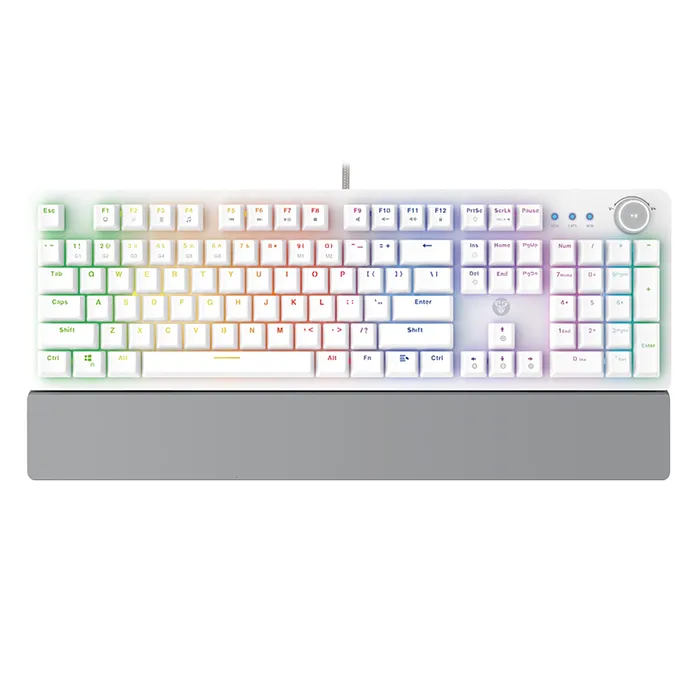 El teclado MaxPower Ingles Gaming [Blanco] de Fantech es una herramienta diseñada específicamente para los entusiastas de los videojuegos y profesionales que buscan un equipo de alto rendimiento y estilo. Este teclado mecánico resalta por su estética moderna con retroiluminación RGB, lo que no solo proporciona una experiencia visual atractiva, sino que también mejora la visibilidad en condiciones de poca luz.