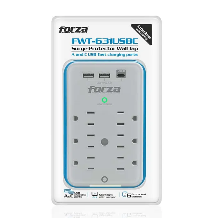 El FWT-631USBC de Forza es un toma corriente protector de voltaje que combina funcionalidad y seguridad en un diseño moderno y eficiente. Este dispositivo es ideal para entornos residenciales y comerciales donde la protección de equipos electrónicos es esencial. Con una capacidad de 1875W y seis salidas NEMA 5-15R, este producto está diseñado para satisfacer las demandas de conexión eléctrica de múltiples dispositivos al mismo tiempo.