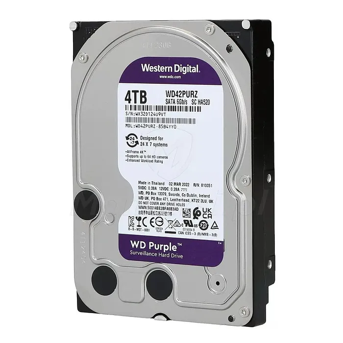El disco duro Western Digital Purple SATA III de 4TB está diseñado específicamente para aplicaciones de videovigilancia. Su construcción robusta y optimizada para la grabación de video lo convierte en la opción ideal para sistemas de cámaras de seguridad, proporcionando una fiabilidad y rendimiento excepcionales en entornos de grabación 24/7.