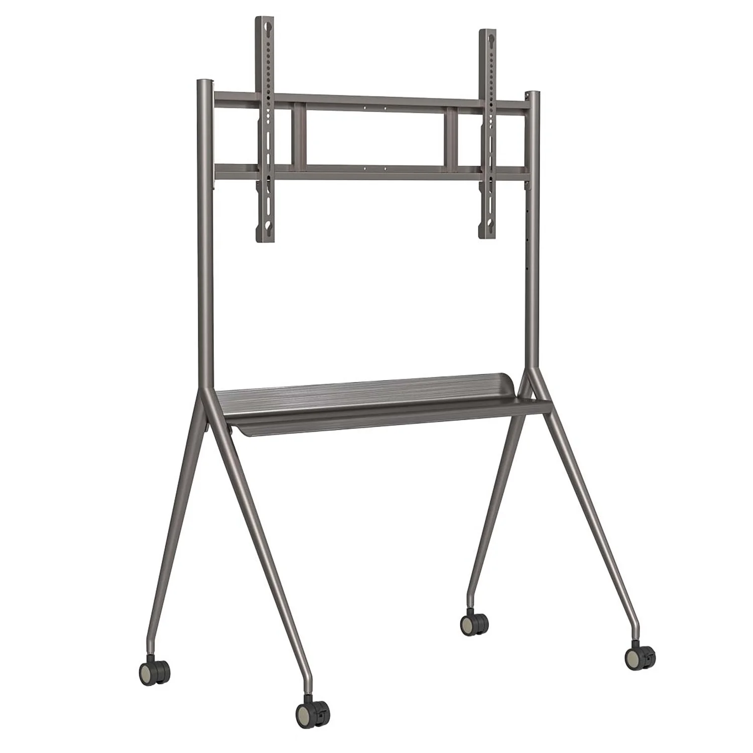 El soporte está fabricado en acero gris plata, lo que le confiere una alta resistencia y durabilidad, asegurando que las pantallas se mantengan seguras en todo momento. Su diseño ergonómico incluye ruedas giratorias que permiten un desplazamiento fluido y fácil, lo que es especialmente útil en espacios donde las pantallas deben ser reubicadas con frecuencia. Además, el soporte cuenta con un sistema de bloqueo en las ruedas, lo cual garantiza la estabilidad durante su uso.