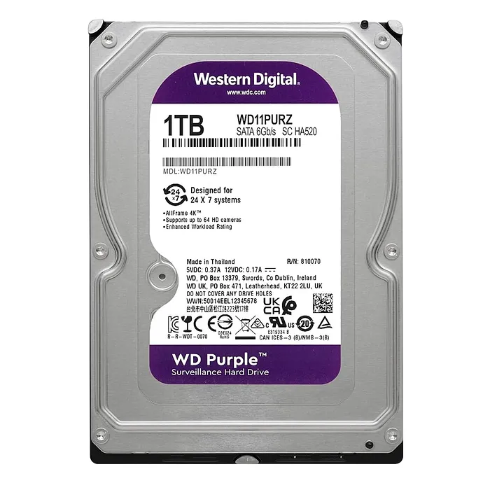Este modelo de disco duro cuenta con una capacidad de 1TB, suficiente para almacenar grandes volúmenes de datos de video. Su velocidad de 5400 rpm es ideal para la grabación de video en alta definición, mientras que el caché de 64 MB optimiza el flujo de datos, permitiendo la captura y reproducción sin interrupciones. El disco duro WD Purple está equipado con tecnología AllFrame, que mejora la reproducción de video al reducir errores de video y mejorar la calidad de grabación.