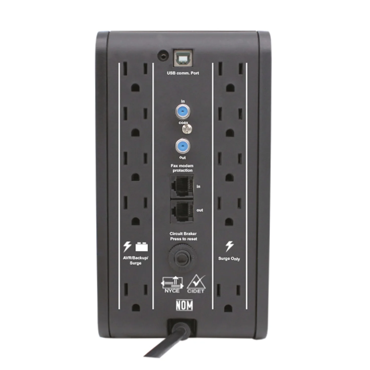 - **Conectividad**: Dispone de 10 salidas NEMA 5-15, distribuidas en 5 salidas AVR/UPS y 5 salidas supresoras de picos, lo que permite una gran versatilidad en la conexión de múltiples dispositivos al mismo tiempo.