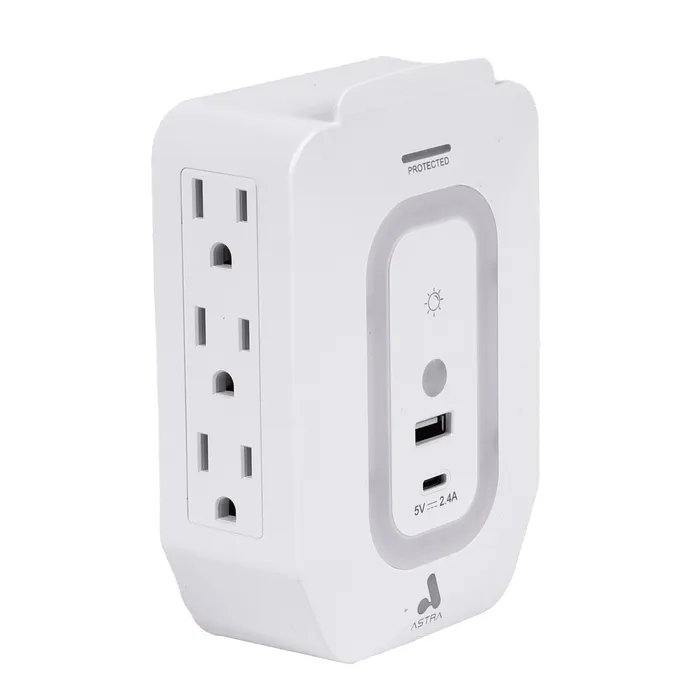 El Toma Corriente Protector de Sobretensiones Astra YB4062UPYD es una solución avanzada diseñada para proteger dispositivos electrónicos de picos de tensión y sobrecargas, al tiempo que proporciona múltiples opciones de conexión. Este dispositivo cuenta con seis salidas tipo 5-15R, una salida USB de 2.4A y una salida USB Tipo C de 5V, lo que lo convierte en una herramienta versátil para hogares y entornos de trabajo.