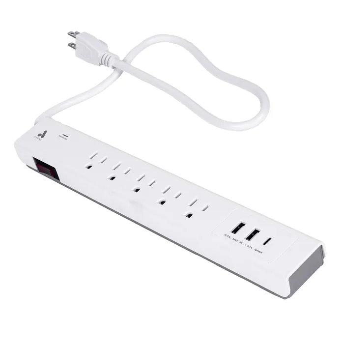 La regleta Astra está equipada con cinco salidas de corriente de tipo 5-15R, lo que permite conectar hasta cinco dispositivos eléctricos simultáneamente, con una capacidad máxima de 125V y 1875W. Además, incorpora dos puertos USB estándar que ofrecen una salida total de 3.1A, permitiendo la carga eficiente de dispositivos móviles y otros aparatos electrónicos. También cuenta con un puerto USB Tipo C de 5V, que es ideal para la carga de dispositivos modernos que utilizan este tipo de conexión.