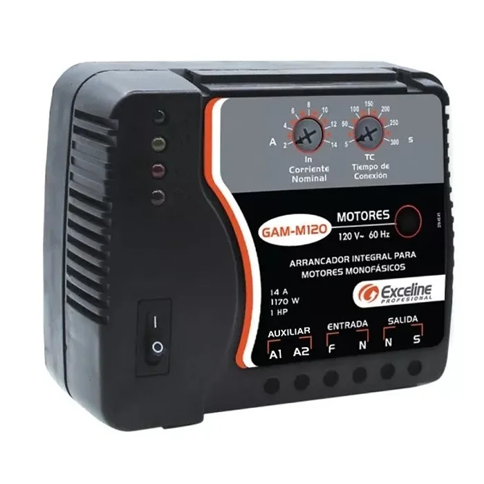 El arrancador de motores monofásicos [GAM-M120] de Exceline es una solución robusta y confiable diseñada para el arranque y control de motores eléctricos de hasta 1HP en aplicaciones de 110V. Este dispositivo es ideal para instaladores que buscan asegurar un funcionamiento eficiente y seguro en diversas aplicaciones industriales y comerciales.