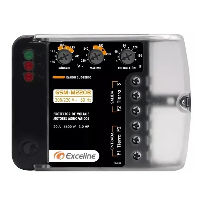 El Protector Motores Monofásicos Exceline GSM-M220B/3 es un dispositivo de protección diseñado específicamente para motores eléctricos monofásicos con una potencia de hasta 3HP y operando a 220V. Este equipo es fundamental para asegurar el correcto funcionamiento de los motores, previniendo daños por sobrecargas, cortocircuitos y fallos en la fase, lo que contribuye a prolongar la vida útil del motor y a optimizar su rendimiento.