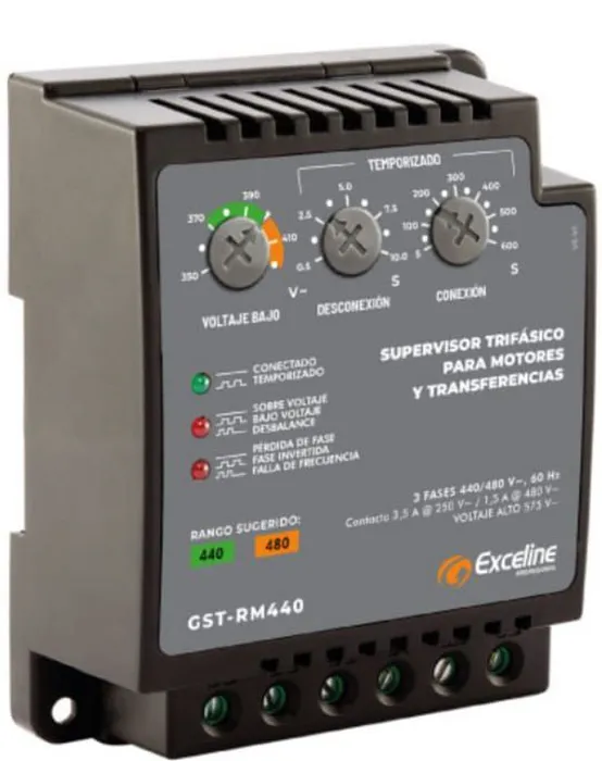 El GST-RM440 Exceline es un supervisor trifásico diseñado para operar a una tensión de 480V, ideal para aplicaciones industriales que requieren un monitoreo constante y eficiente de las condiciones de operación de sistemas eléctricos. Este dispositivo está equipado con una bornera que permite una conexión sencilla y segura, facilitando la instalación y el mantenimiento.