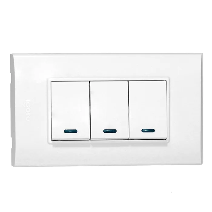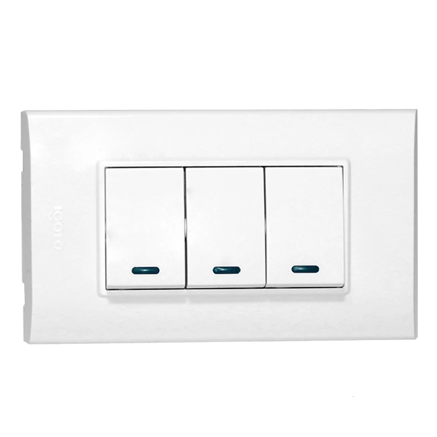 El interruptor triple serie B Igoto modelo B516-W en color blanco es una solución diseñada para el control eficiente de la iluminación en diversas aplicaciones residenciales y comerciales. Este interruptor de alta calidad no solo ofrece una estética moderna y limpia, sino que también garantiza un rendimiento óptimo y duradero, características que lo convierten en una opción ideal para instaladores profesionales.