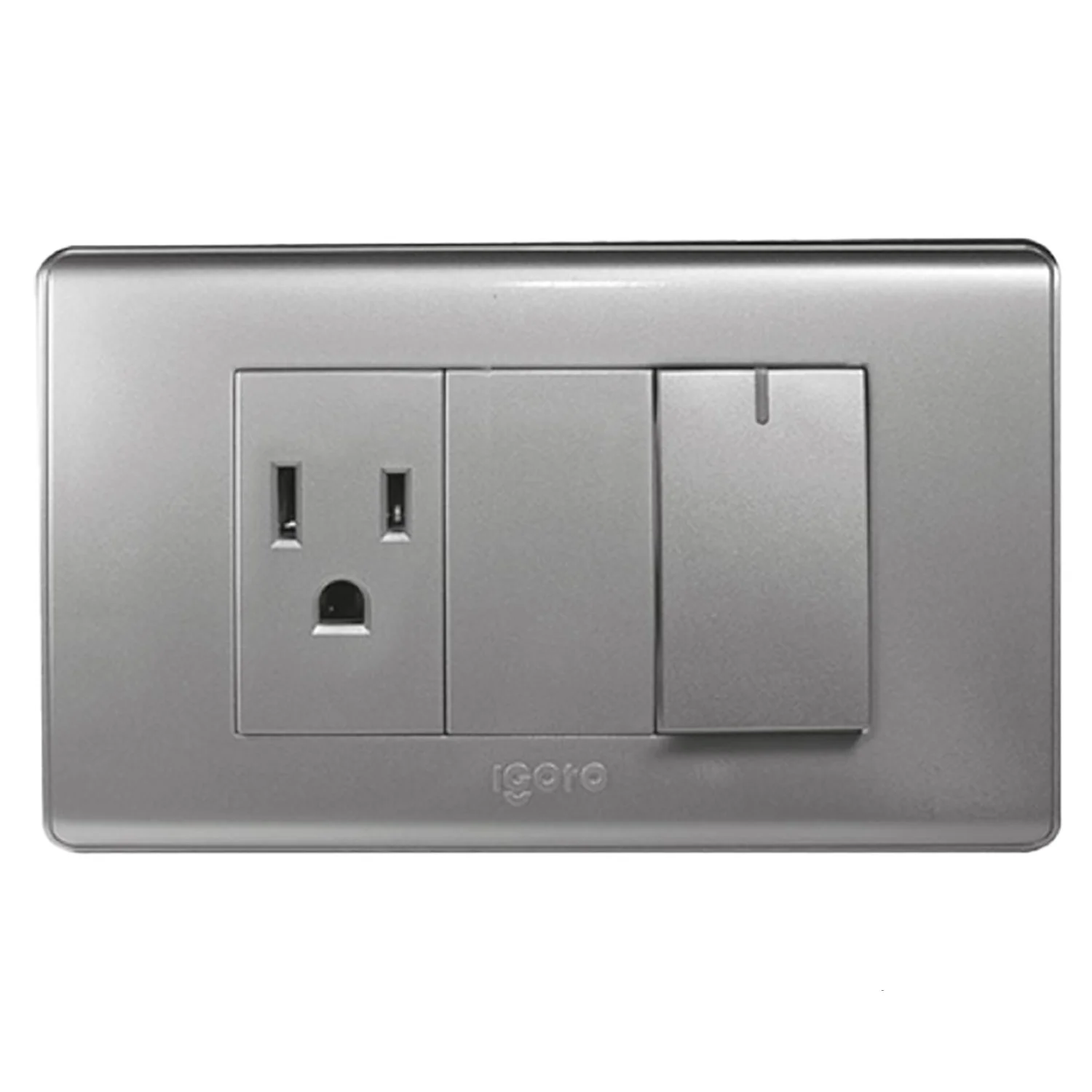 El interruptor simple combinado con toma corriente Igoto A2036-S es una solución integral diseñada para proporcionar un control eficiente de la iluminación y el suministro eléctrico en diversas aplicaciones residenciales y comerciales. Este dispositivo, parte de la serie A, se presenta en un elegante acabado en plata que se integra perfectamente en cualquier entorno moderno o contemporáneo, proporcionando un toque estético que complementa su funcionalidad.