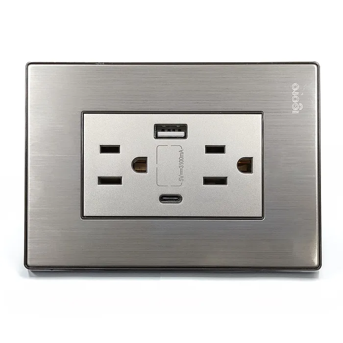La toma corriente Igoto I105/2U-C es una innovadora solución diseñada para satisfacer las necesidades de conectividad moderna en entornos residenciales y comerciales. Este dispositivo combina la funcionalidad de una toma de corriente con toma de tierra, puertos USB y Tipo C, todo en un elegante diseño de la serie Inox.