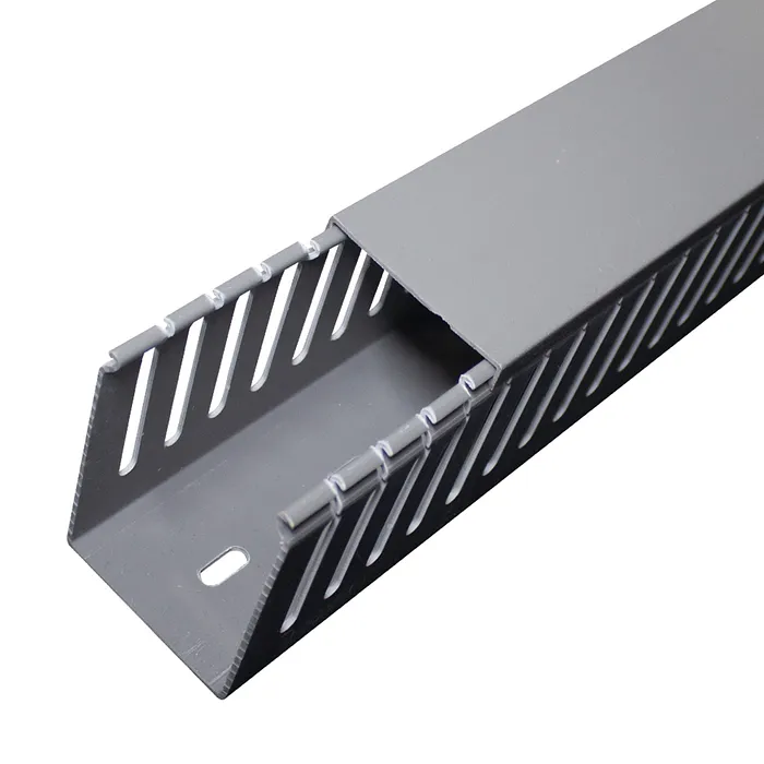 El diseño ranurado de la canaleta permite una ventilación adecuada y una fácil identificación de los cables, lo que facilita el mantenimiento y la modificación de instalaciones existentes. Su color gris neutro es ideal para integrarse de manera estética en cualquier entorno, siendo una opción versátil para diversas configuraciones.