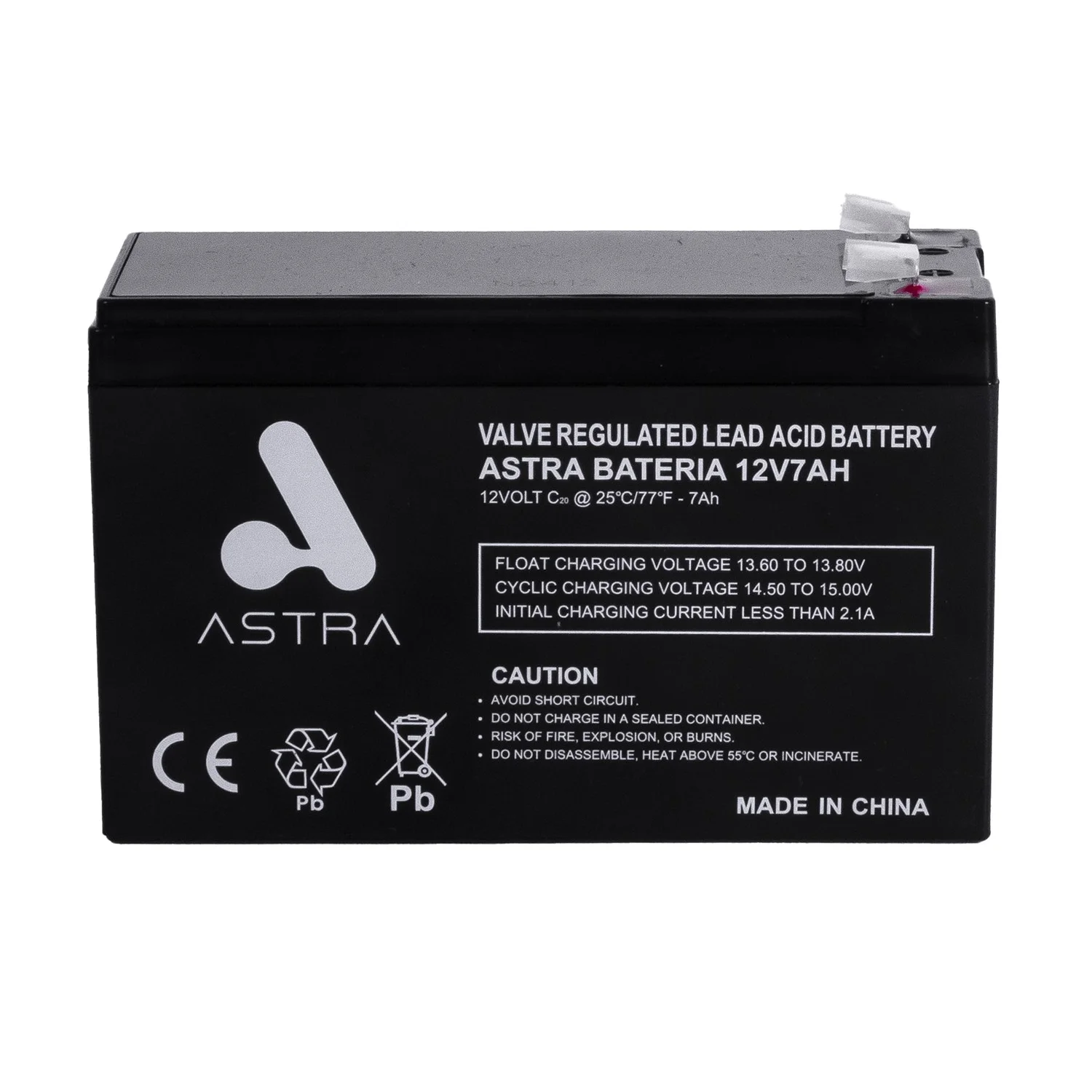 La batería Astra 12V 7Ah destaca por sus características técnicas que aseguran un funcionamiento seguro y eficaz: