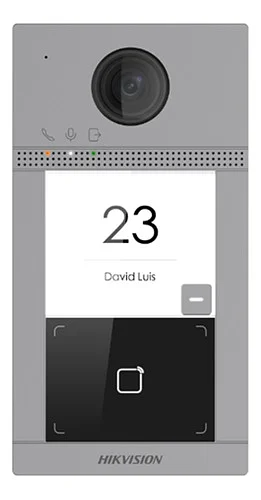 El dispositivo incluye un interfaz intuitivo que facilita su uso, y es compatible con sistemas de control de acceso Hikvision, lo que permite una integración sencilla con otros equipos de seguridad. Asimismo, cuenta con un micrófono y un altavoz de alta calidad, ofreciendo comunicación bidireccional clara entre el visitante y el residente.