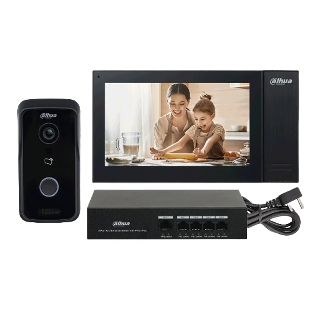[DHI-KTP02] Dahua - Kit de Videoportero IP con Monitor Táctil de 7" Frente de Calle con Apertura remota y Tarjetas Mifare (IC Card) Incluye Switch PoE de 4 Puertos 10/100