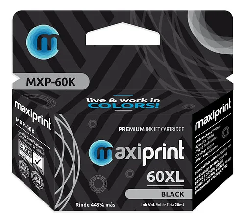 El cartucho Maxiprint 60XL es compatible con una amplia gama de impresoras de las principales marcas, especialmente con modelos que utilizan cartuchos de tinta negra serie 60XL. Entre las impresoras compatibles se incluyen, pero no se limitan a: