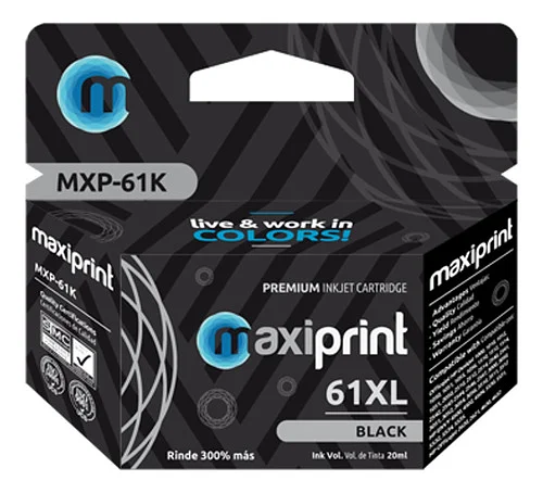 El cartucho de tinta Maxiprint Negro 61XL constituye una opción confiable y eficiente para usuarios que requieren impresiones en alta calidad y volumen considerable. Su diseño permite una instalación sencilla y un funcionamiento estable, mientras que su tinta de pigmento asegura textos con negros intensos y duraderos. Compatible con una amplia gama de impresoras HP, este cartucho maximiza el rendimiento y reduce la necesidad de recambios frecuentes, optimizando tiempos y costos operativos. Además, su compromiso con el medio ambiente mediante materiales reciclables y procesos responsables lo convierte en una opción consciente y profesional para entornos de impresión exigentes