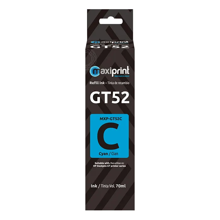 La tinta Maxiprint HP 70ml Cyan GT52 es compatible con modelos específicos de impresoras que utilizan cartuchos o sistemas de tinta continua con referencia GT52. Su formulación está diseñada para ofrecer una fluidez óptima que facilita la absorción del papel sin generar manchas ni corrimientos.