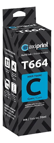Este producto se presenta en un envase de 70ml, lo que ofrece una capacidad suficiente para un volumen considerable de impresiones, optimizando el costo por página y reduciendo la frecuencia de recargas. La tinta cyan de Maxiprint está elaborada bajo estrictos controles de calidad para asegurar compatibilidad total con los cabezales de impresión y minimizar riesgos de obstrucciones, prolongando la vida útil de la impresora.